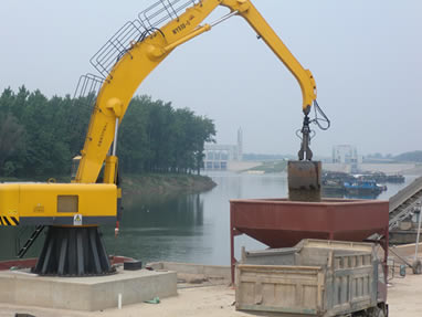 電動(dòng)液壓固定式抓料機(jī)奮戰(zhàn)在碼頭礦山卸船一線